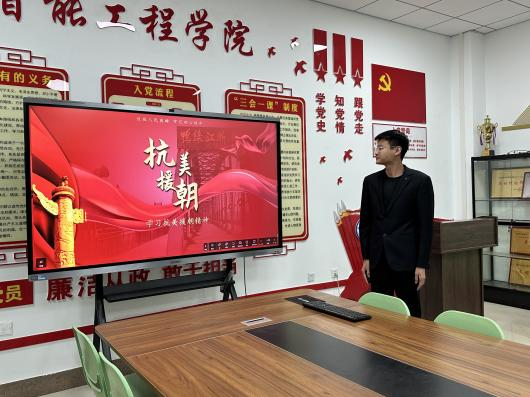 会上,学生党员张建衡为同志们讲解了抗美援朝精神。抗美援朝战争是一场保卫和平、反抗侵略的正义之战,其伟大胜利不仅是中朝两国人民和军队团结战斗的胜利,更是维护世界和平与人类进步事业的伟大胜利。抗美援朝战争所锻造形成的伟大抗美援朝精神,是一份极为宝贵的精神财富,值得我们铭记和传承。
