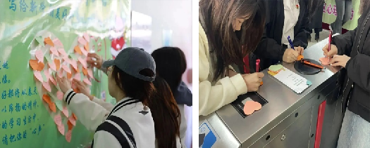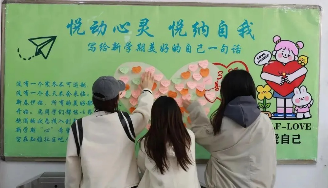 同时,在“悦动心灵 悦纳自我”主题展板上,同学们写下关于个人梦想、未来目标、温暖鼓励的话语。一句句话汇成一股股暖流,流淌在每一个同学的心中。