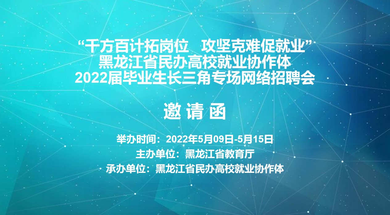 为抢抓当前高校毕业生求职择业关键期,坚持疫情防控与毕业生就业工作统筹推进,多措并举促进高校毕业生就业工作,推进我省毕业生更好地服务长三角地区企业人才的需求,实现毕业生更加充分、更高质量就业。由黑龙江省教育厅主办,黑龙江省民办高校就业协作体承办的“千方百计拓岗位 攻坚克难促就业”黑龙江省民办高校就业协作体2022届毕业生长三角专场网络招聘会,诚邀贵单位莅临参会,招才引智。现将具体安排函告如下: