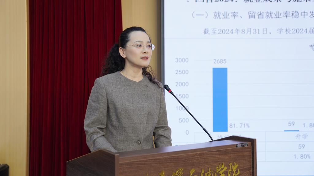 党委副书记宁晶对2024届就业工作进行了全面总结,并肯定了过去一年学校在就业工作中取得的积极成效。同时,也深入剖析了当前就业工作存在的短板,直面当下严峻的就业形势所带来的挑战。针对2025年的就业工作,宁晶副书记提出了七项具体措施开启春季攻坚:一是让五级包保“动起来”,强化责任落实;二是使就业指导“强起来”,提升学生就业竞争力;三是让访企拓岗“跑起来”,拓展就业市场;四是让校园招聘“活起来”,丰富就业渠道;五是将困难帮扶“助起来”,关注特殊群体;六是把信息平台“用起来”,提高信息服务水平;七是确保不触底线“严起来”,规范就业工作流程。