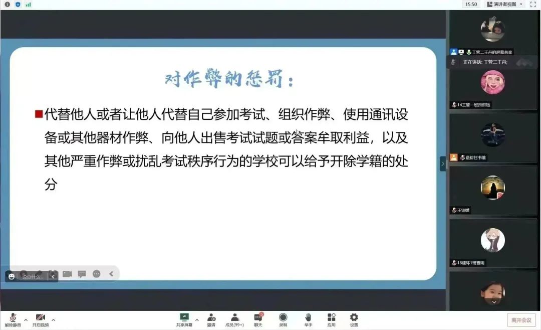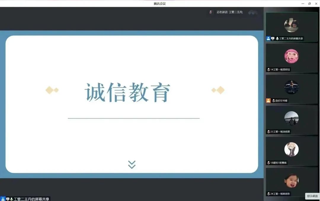 为践行社会主义核心价值观,引导同学们共同倡导诚信风气。土木工程学院于2022年12月3日召开了以诚信教育为主题的班会。本次班会在线上进行,由2022级辅导员王铁媛主讲,2022级全体同学参加。