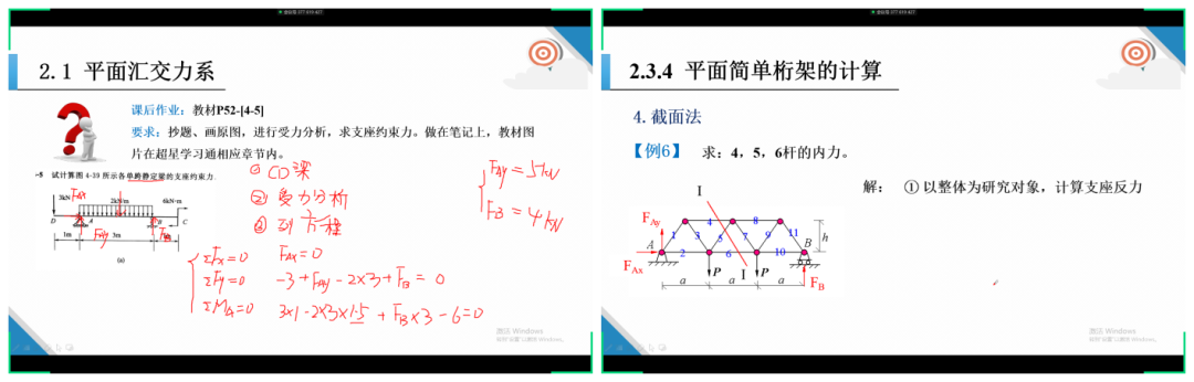 力学教学中一大特点就是理论推导多,公式多。线上直播中,如仅仅采用鼠标及手写板,字迹效果不是太理想。为应对这一难题,我主要是采用多级动画,分步骤推进的模式,避免整篇载入。疫情期间,大部分学生没有纸质教材,不方便查找已学公式,在推导过程中,如遇之前所学重要公式,也会加入相关内容,方便学生理解与巩固。
