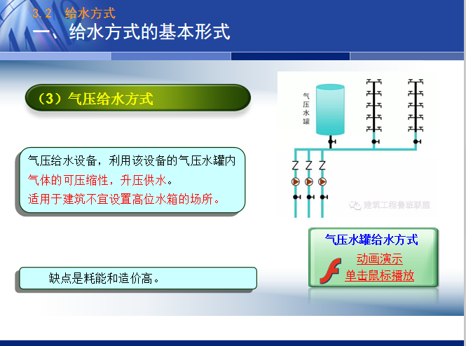 《建筑设备工程》课程当中建筑给水方式形式多样,设备工作原理等尽量用动图展示,更容易让学生理解并且印象深刻便于记忆。