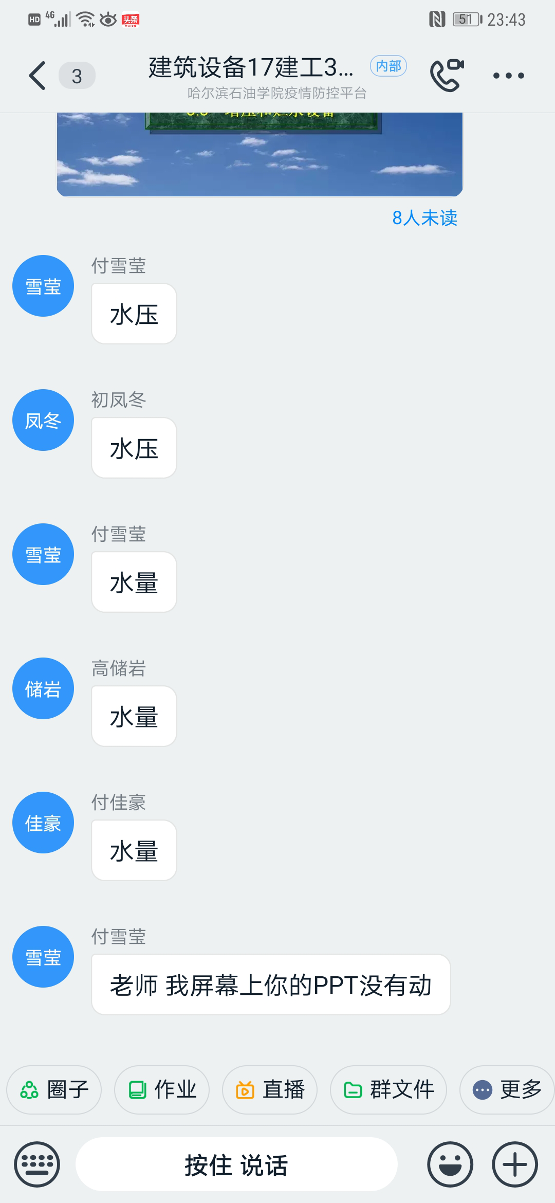 上课中重要的知识点也要有必要练习与讲解。与可以先让学生在群中上传自己的答案,然后有针对性的进行讲解。