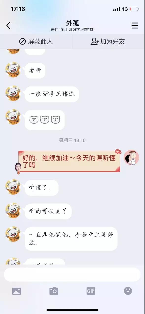 在收到线上教学任务之初,我便开始利用各大平台网络课程资源库,筛选与本课程相关的可用的教学资源。在线上授课的过程中,我比以往更加关注同学们的课堂反应,我会鼓励大家课堂敢于发声、乐于发言的习惯。对于课堂表现积极的学生,我会予以口头表扬以及平时成绩加分的奖励。通过精神与物质双重鼓励,学生的学习状态愈发积极。在课程结束后我会要求大家上传笔记情况,并利用“学习通”平台布置课下学习作业以及测验。在平时的生活中,我也会经常与学生聊天,关心学生的生活状态以及学习情况。当收到学生积极正面的评价时,我瞬间觉得所有的精心准备都是值得的,我相信“战役必胜,网课必成!”。
