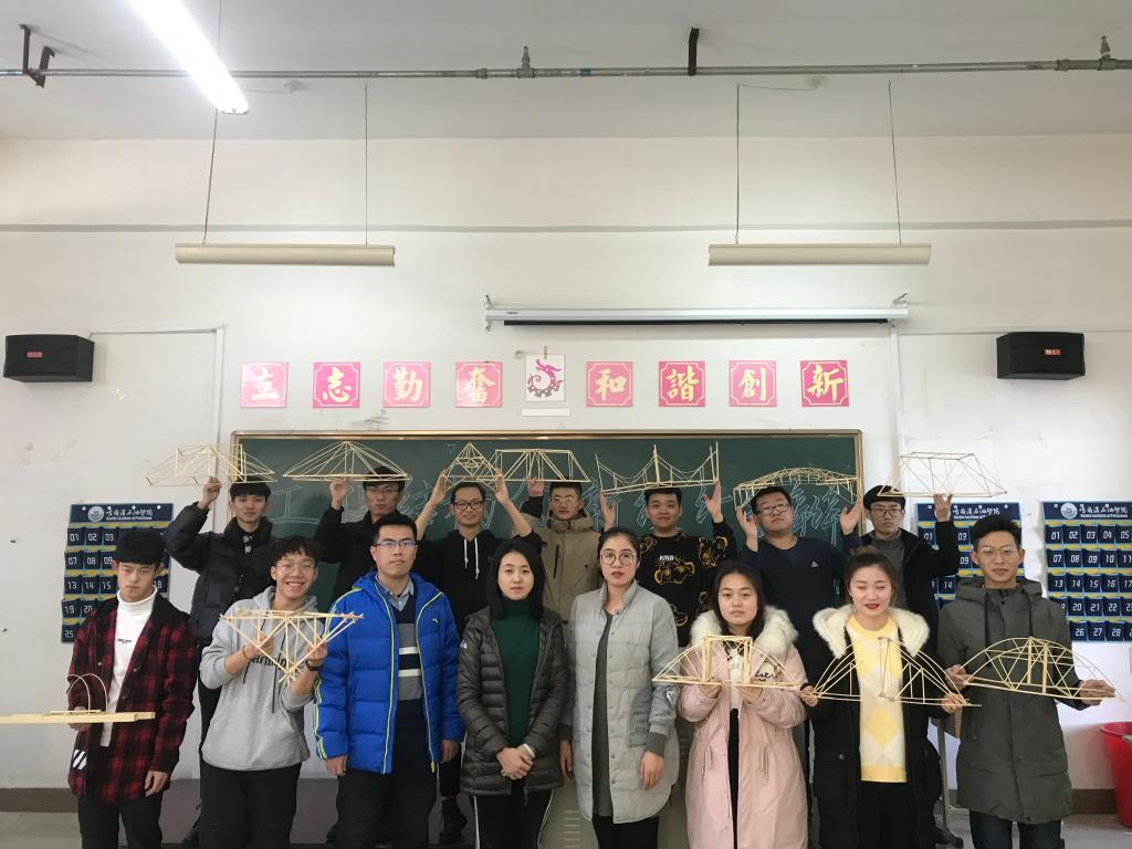 为深刻贯彻OBE教学理念,进一步激发学生的工程结构创新意识,培养学生的创新思维、团队协作和实践能力,加强学生之间的交流与合作,提高人才培养质量,营造校园科技文化氛围,土木工程学院2017级土木工程专业(道桥方向)开设了为期1周的《工程结构创新设计》实践环节,并于2019年12月20日在主教602教室进行了加载试验与小组答辩环节。土木工程学院教师于姜涛、刘洪瑞作为本次答辩的评委。