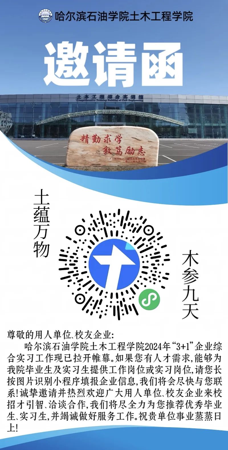 冰球突破豪华版官方网站土木工程学院2024年“3+1”企业综合实习工作现已拉开帷幕。如果您有人才需求,能够为我院毕业生及实习生提供工作岗位或实习岗位,请您长按图片识别小程序填报企业信息,我们将会尽快与您联系!诚挚邀请并热烈欢迎广大用人单位、校友企业来校招才引智、洽谈合作,我们将尽全力为您推荐优秀毕业生、实习生,并竭诚做好服务工作。祝贵单位事业蒸蒸日上!