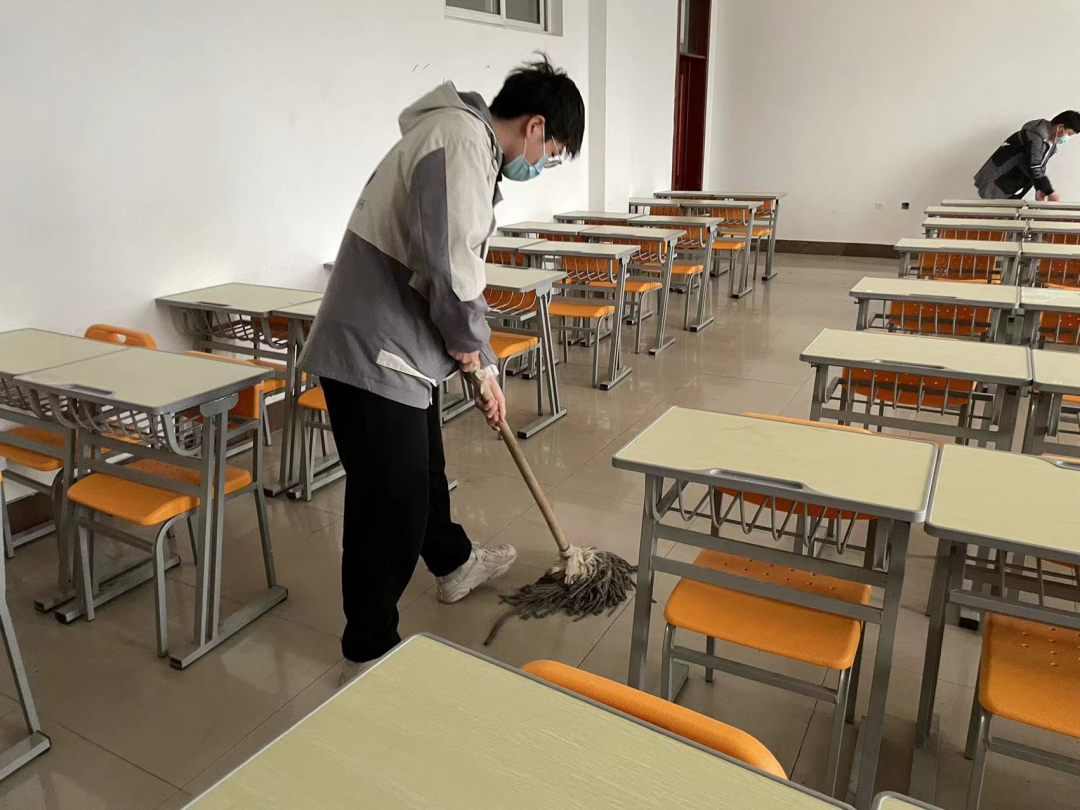 志愿者们首先对桌椅进行摆放,对地面进行打扫,准备了消毒喷壶。学习了针对教室地面、桌椅的消毒方法和自我防护措施等内容。对教室每一处都进行了细致地消杀,不留死角、不留盲区,为在校师生构筑安全屏障。整个过程都严格按照消毒流程科学、规范的进行。并做好教室日常的通风换气工作,保持室内空气流通。营造卫生、整洁、健康、文明的校园环境。