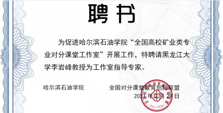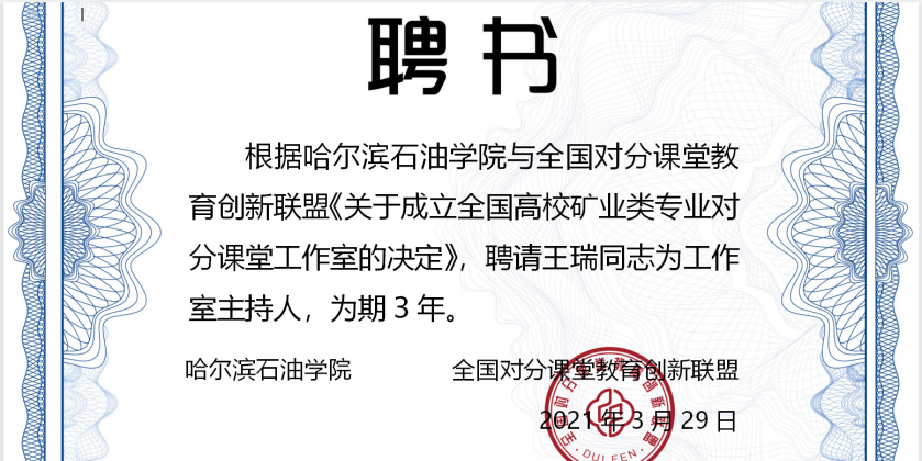 2021年3月29日,经冰球突破豪华版官方网站石油工程学院和全国对分课堂教育创新联盟批准,冰球突破豪华版官方网站石油工程学院正式成立全国“高校矿业类专业对分课堂工作室”,聘请王瑞为工作室主持人,工作室受联盟指导,并聘请黑龙江大学李岩峰教授为指导专家。