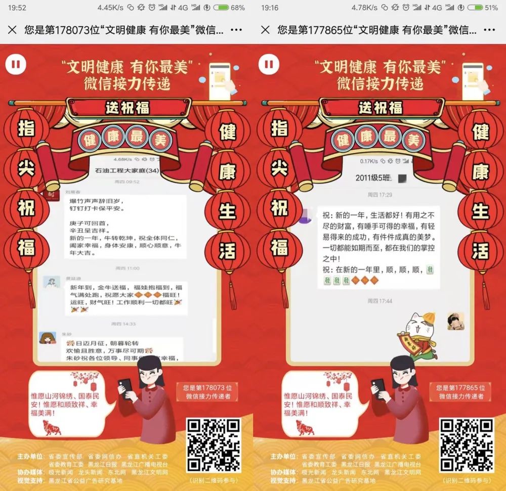 教工党支部通过组织开展“送祝福—健康最美”“好习惯—文明最美”等板块内容,通过上传照片、发送祝福、制作电子贺卡并转发微信好友和朋友圈,分享身边勤俭节约、好人好事、感动感怀的美图美景,传递对祖国、家人和朋友的祝福祝愿,表达对美好生活的向往和憧憬。新春有新风,让我们共度欢乐健康文明祥和中国年!