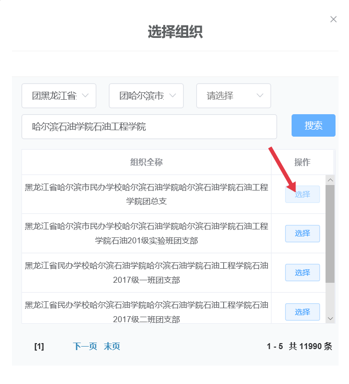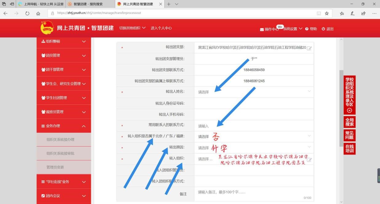 其中,转入组织是否属于北京/广东建一栏填“否”,转接原因选择“升学”。申请转入组织选项选择团黑龙江省委-团哈尔滨市委,搜索“冰球突破豪华版官方网站石油工程学院”(组织全称:黑龙江省哈尔滨市民办学校冰球突破豪华版官方网站冰球突破豪华版官方网站石油工程学院团总支),具体选项如下图所示: