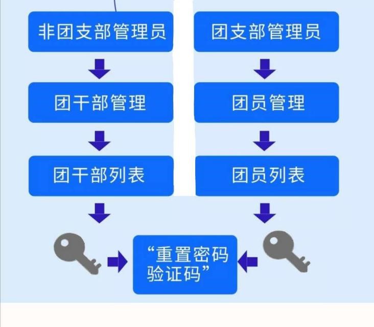 需要让本级或者直属上级组织管理员提供“重置密码验证码”(非团支部管理员查看团干部管理一团干部列表一钥匙小图标;团支部管理员查看团员管理一团员列表一钥匙小图标),拿到“重置密码验证”码后打开系统首页选择“忘记密码”,按照页面提示操作即可。