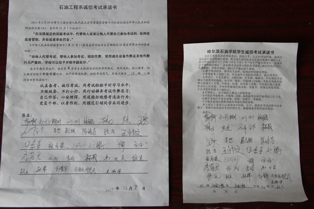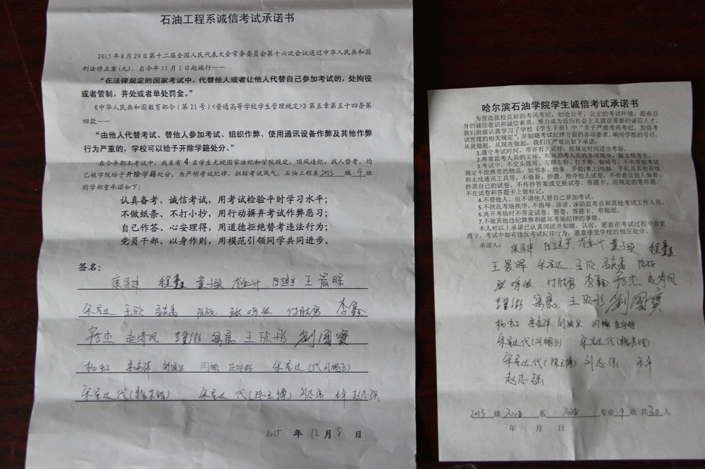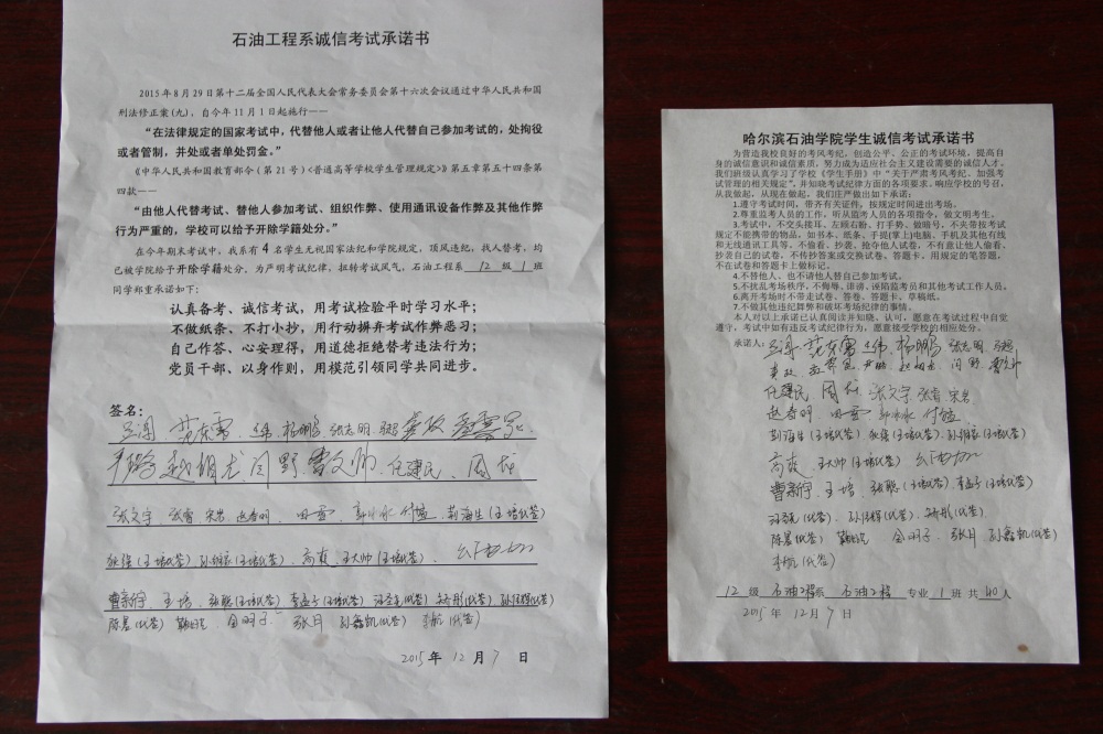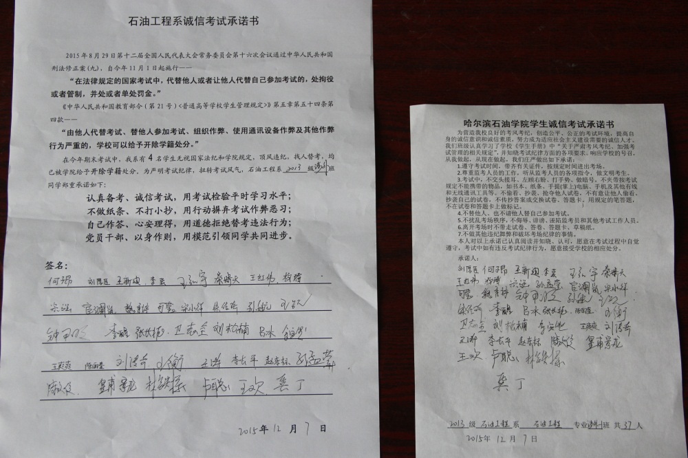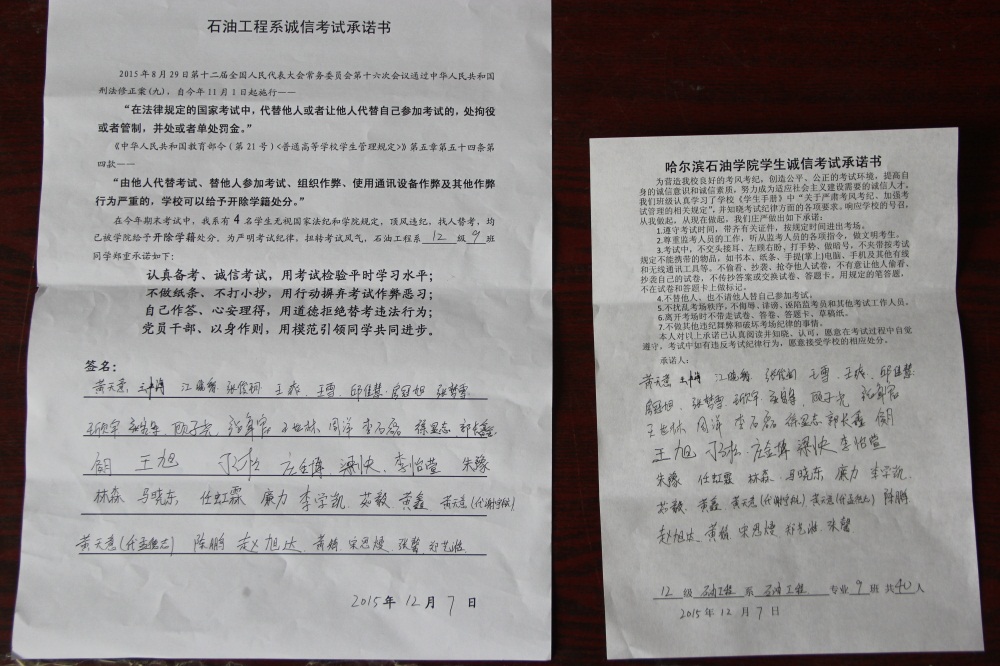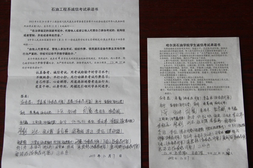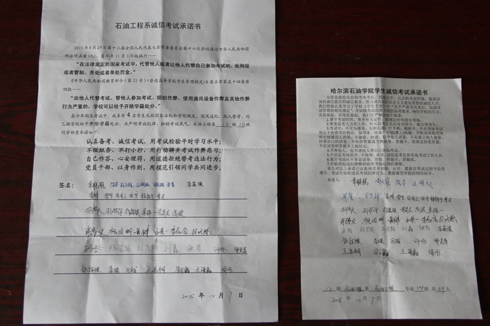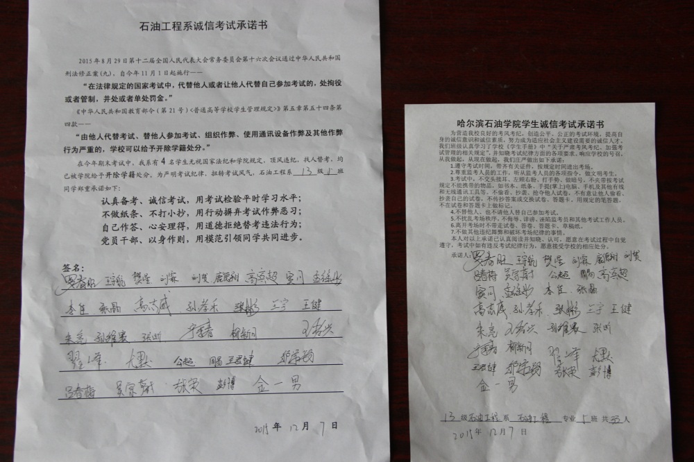 石油工程系要求班级每名学生同时在学院和系印发的考试承诺书上签名,在外实习的学生也要指定专人代替签字,做到不漏一人。同时,在考试这项工作上做到“两个绝不”:在考试违纪的问题上,绝不包庇护短,绝不回避问题。对出现问题的学生,坚决支持学院有关部门依纪依规做出严肃处理,为学院学风考风建设保驾护航。