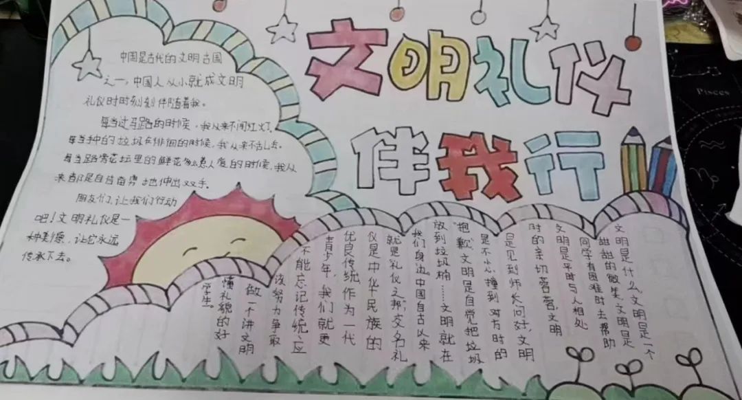 手抄报设计是视觉传达的表现形式之一,通过版面的构成在第一时间内将人们的目光吸引,并获得瞬间的刺激,这要求设计者要将图片、文字、色彩、空间等要素进行完整的结合,以恰当的形式向人们展示出宣传信息。在本次活动中,参赛人员展现了自己作品的蕴含意义,从不同角度展示他们对于礼仪的理解和感悟。加深了同学们对礼仪文化的了解和所蕴含的中华传统精神,使同学们明白,礼仪作为中华传统美德,我们应该尊重,应该传承。