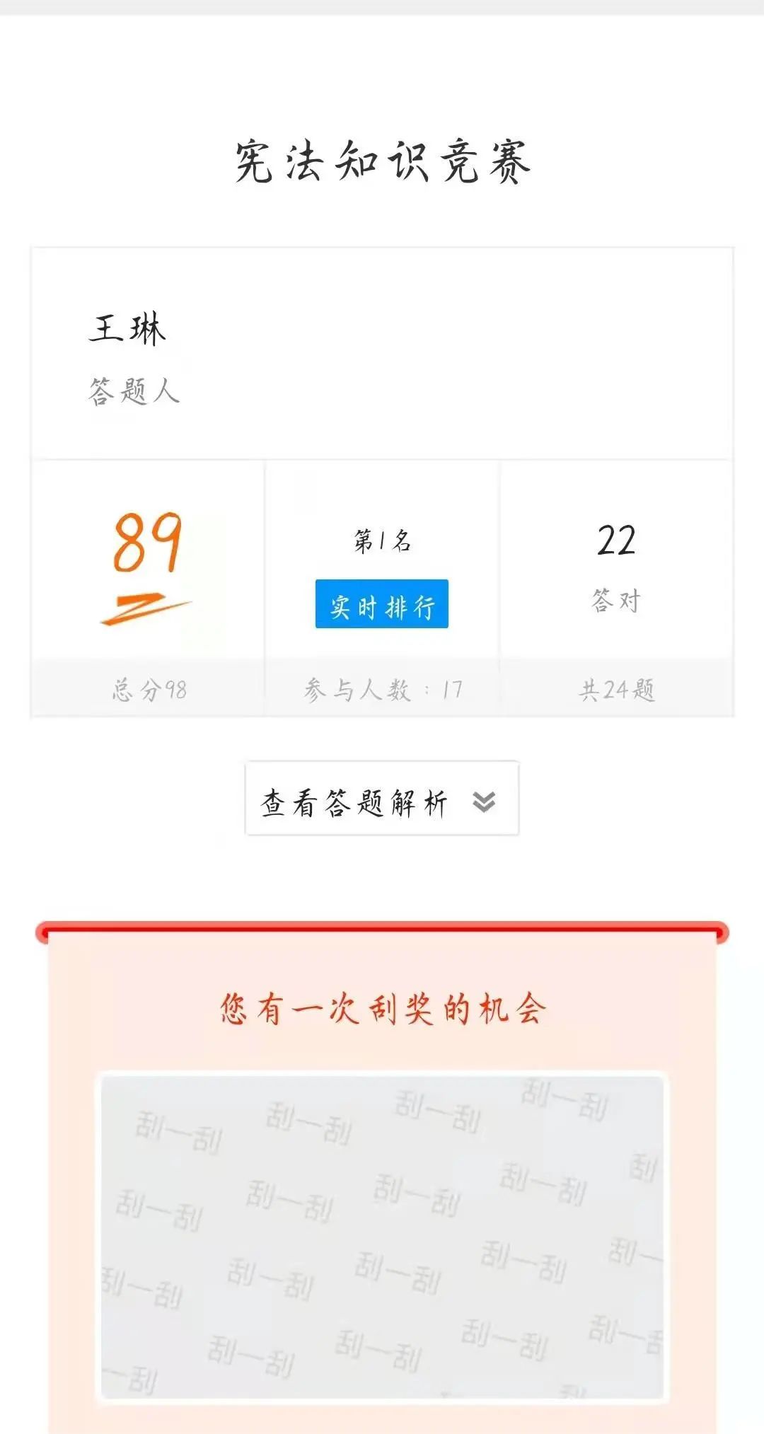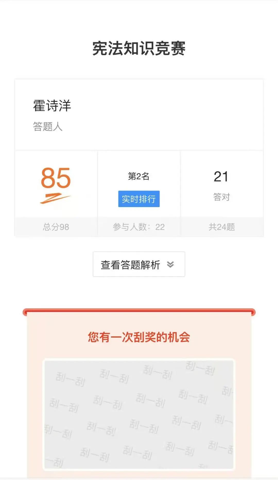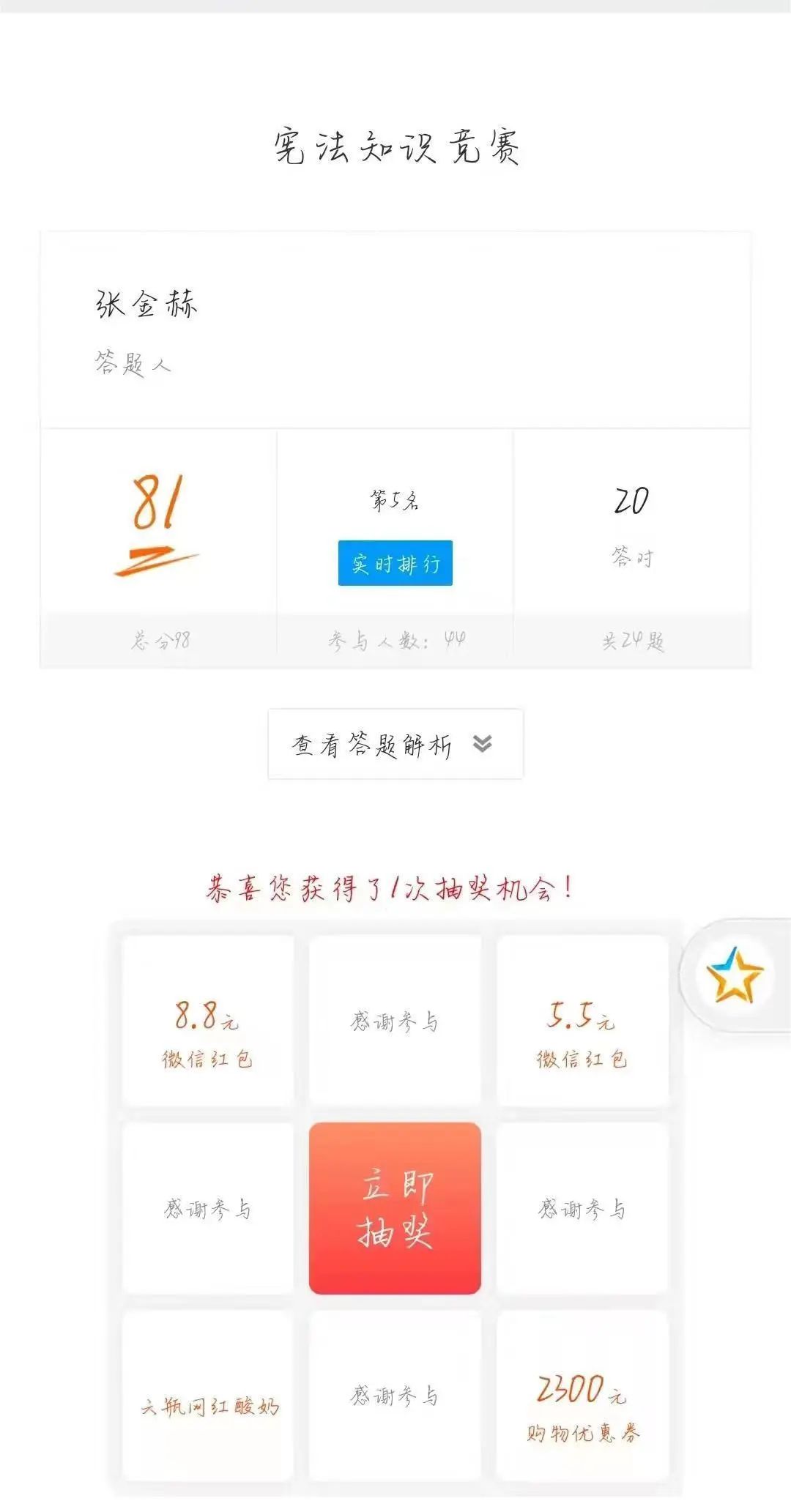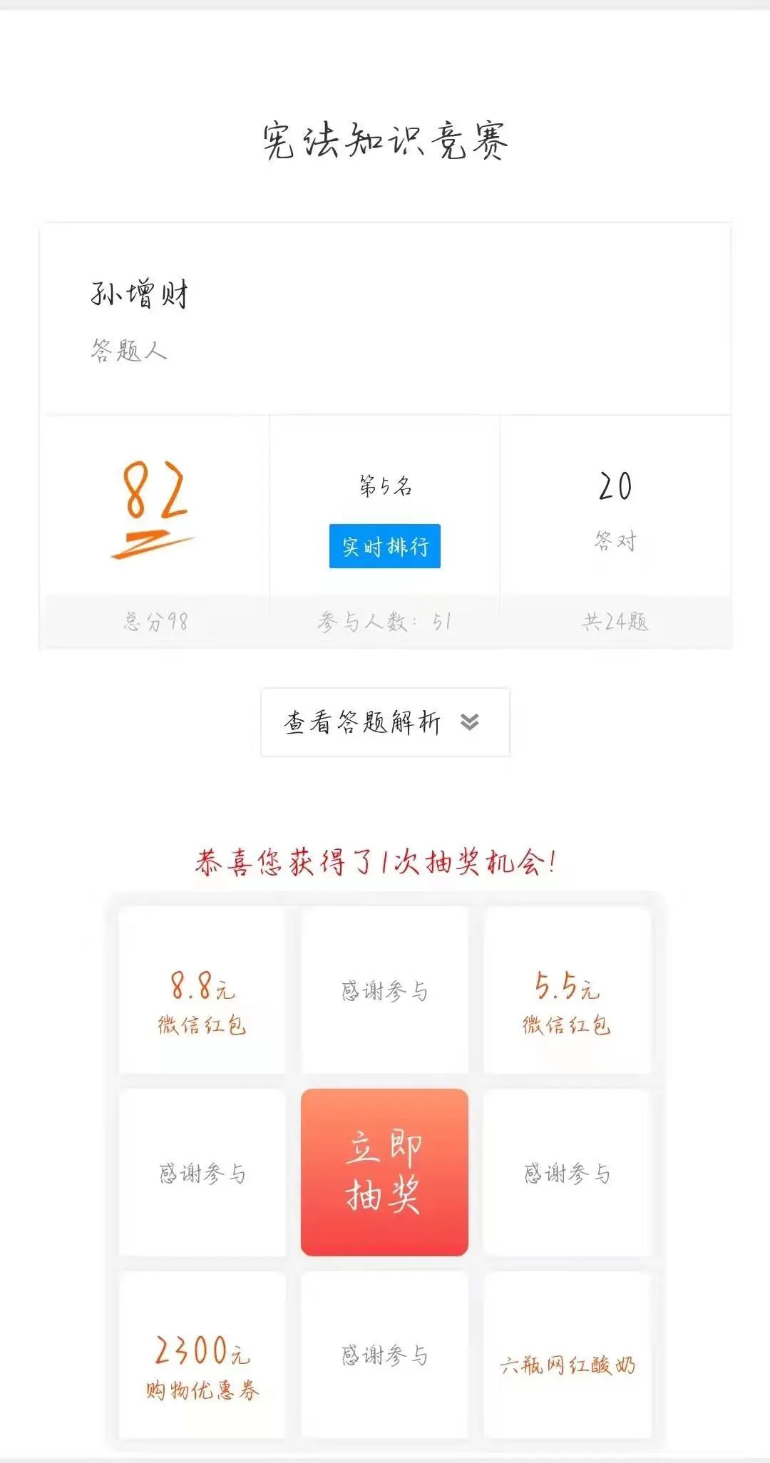 活动中,学生积极参与,通过扫描二维码进行答题,活动题目设有选择题、共25道题,内容丰富、涵盖知识面广。通过线上的知识竞赛,使大家了解相关法律,填补对法律认识的空缺,从而传递宪法在国家发展,社会中的重要性,同时让学生明白在今后受到危险和伤害时拿起法律的武器来保护自己,捍卫自己,通过法律途径更好地保护自己。