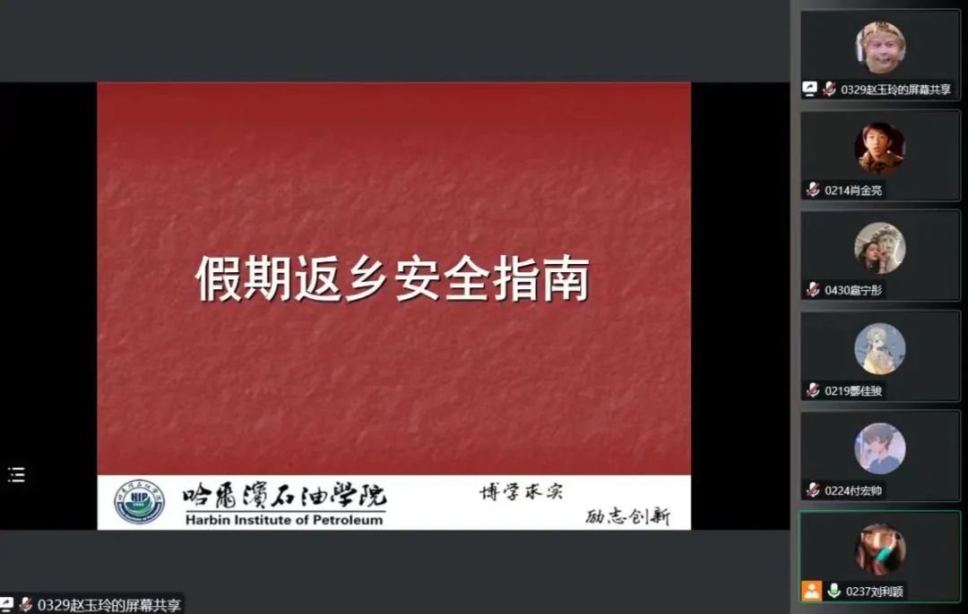 为提高同学们的安全防范意识,使同学们掌握安全防范技能,确保学生能够平安离校返乡。11月29日,我院通过腾讯会议在线上召开返乡交通安全教育会议,我院各年级辅导员及全体同学参加会议,此次会议由我院党总支书记刘雁春主持。