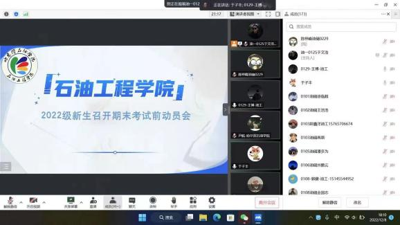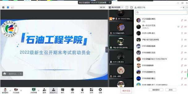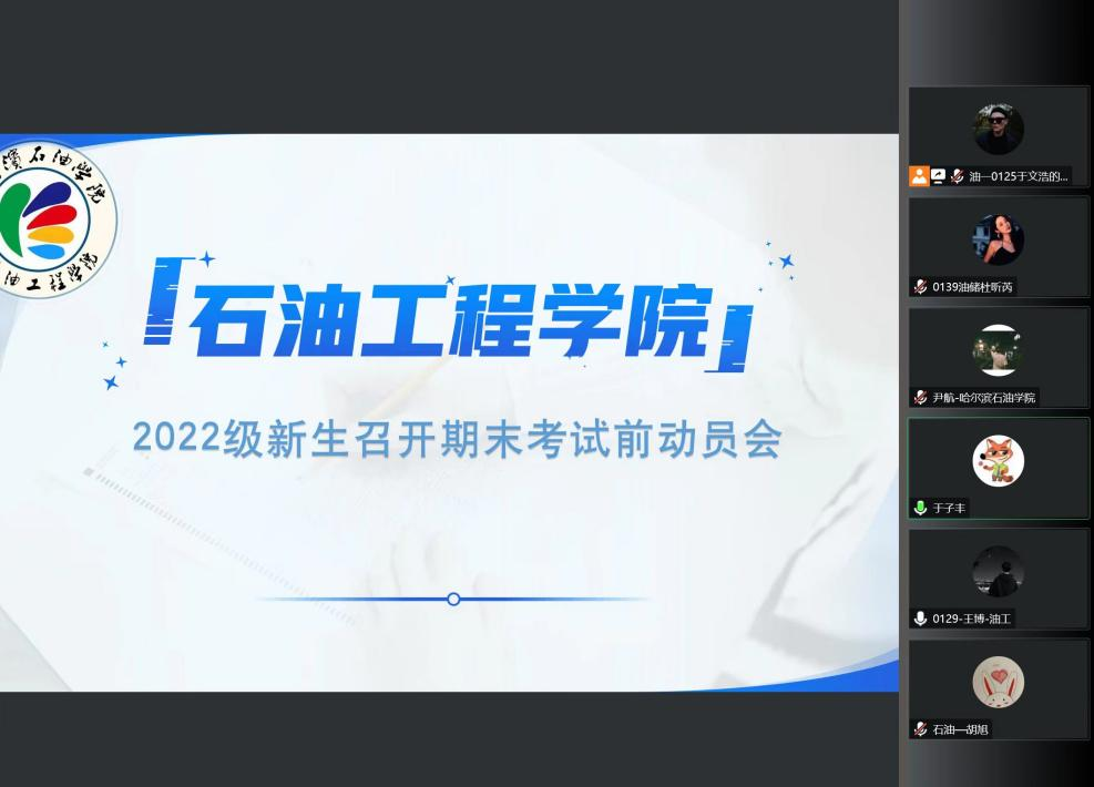 为帮助学生树立正确的学习观念,端正考风考纪,引导学生做好大学规划和期末复习安排。12月8日晚,我院召开线上期末动员大会。由22级辅导员尹航主持会议,石油工程系主任胡旭和油气储运工程系主任于子丰主讲,2022级全体新生参加。