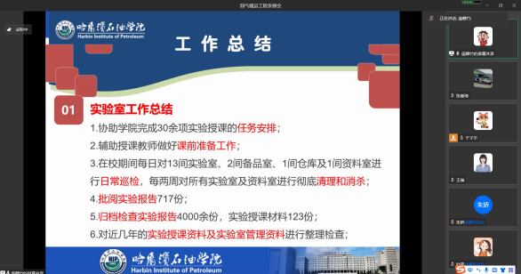 首先在于子丰主任的主持下,所有教师按照顺序进行了个人本学期主要工作内容的总结。个人汇报结束后,于子丰主任对本学期各位老师的各项工作表示了肯定,在全体教师共同的努力,油气储运工程系顺利完成了本学期的理论教学,实践教学和19级企业综合实习指导工作,以及指导教师带领学生参加学院组织的“博创杯”创新创业大赛、冰球突破豪华版官方网站第一届油气储运设计大赛,各位老师也组队积极参与教改项目等,并强调在今后授课中要各位教师应加强融入课程思政,鼓励老师积极申报课程思政师范课程等项目。