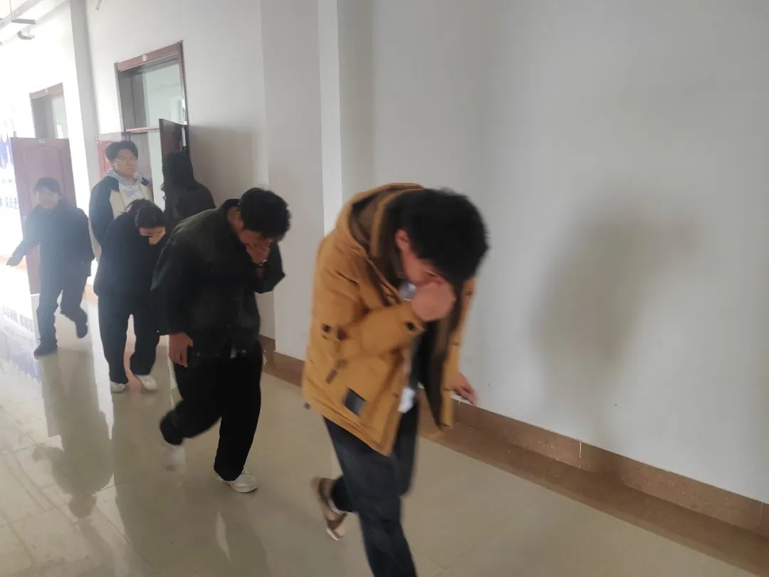 随后,演练开始。学生们在楼内快速有序地疏散,并用湿毛巾捂住口鼻、弯着腰,按照预定的疏散路线安全撤离到公寓门口的安全区域。