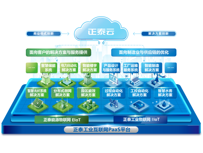 正泰抢抓数智化、双碳目标新发展机遇,不断深化“一云两网”战略,将“正泰云”作为智慧科技和数据应用载体,率先构建能源物联网、工业物联网平台,在绿色低碳发展新蓝海中争做探索者、倡导者、实践者。以“绿源、智网、降荷、新储”系统服务能力,打造平台型企业,构筑区域智慧能源产业生态圈,为公共机构、工商业及终端用户提供一揽子能源解决方案,实现节能降碳、加速能源转型。
