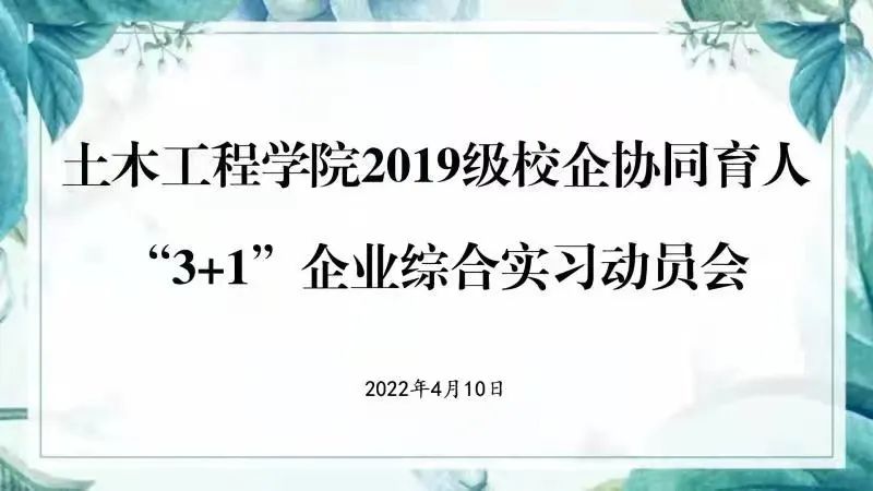 为深入推进校企协同育人模式,建立校企深度融合的长效合作机制,进一步提高人才培养质量,切实增强学生综合实践能力,持续做好校企协同育人“3+1”企业综合实习阶段学生的教育管理和服务工作,4月10日下午1点30分,土木工程学院召开2019级学生校企协同育人“3+1”企业综合实习动员会。会议由党支部书记宋旭主持,院长盖晓连、副院长张佰真铭、2019级辅导员王雪、各系主任、全体指导老师及2019级学生参加会议。