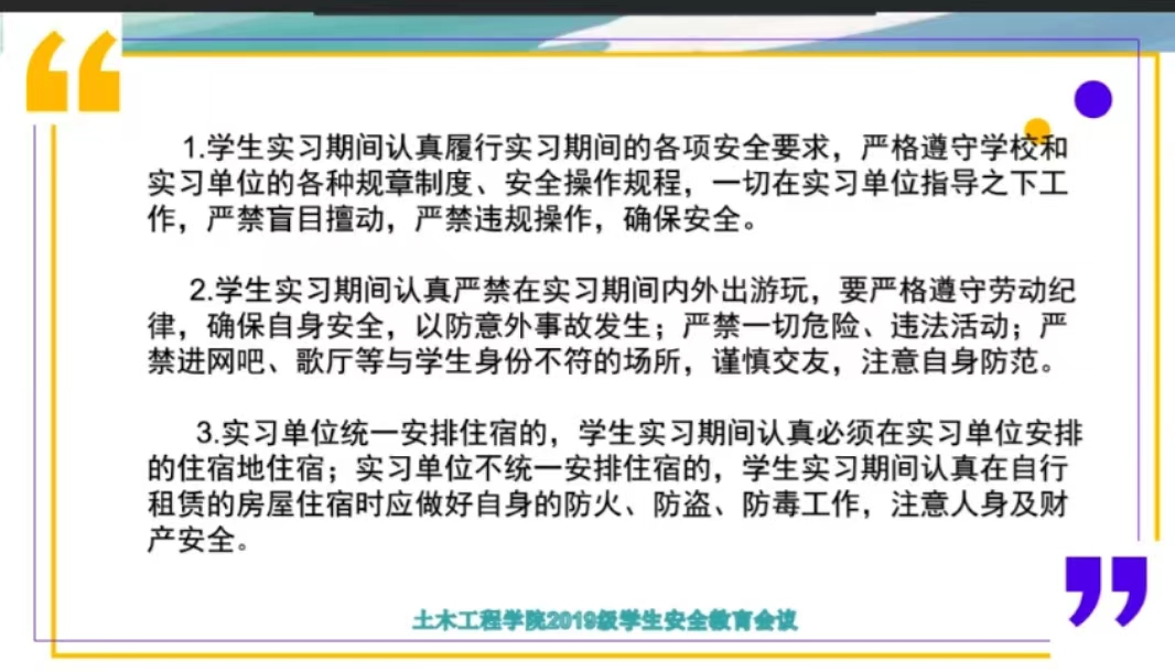 在本次安全教育班会中,土木工程学院2019级辅导员王雪老师再次和同学们强调了实习期间的各项要求,学生在到岗后要严格遵守学校和实习单位的各种规章制度、安全操作规程,要在实习单位指导下工作,严禁盲目擅动,严禁违规操作,同学们在实习中也要牢固树立安全意识,在岗位实习过程中要注意人身安全、财产安全、饮食安全和出行安全。
