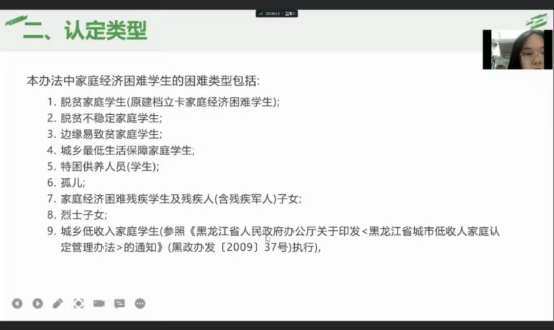 接下来,在班会中,王雪老师向2019级同学们公布了本年度家庭经济困难学生认定工作的开展情况,详细讲述了认定程序、依据和原则,就各班级认定工作开展情况向同学进行了公示。此外,也从诚信参与和资助育人的角度,教育学生在参加认定时要本着实事求是的原则。