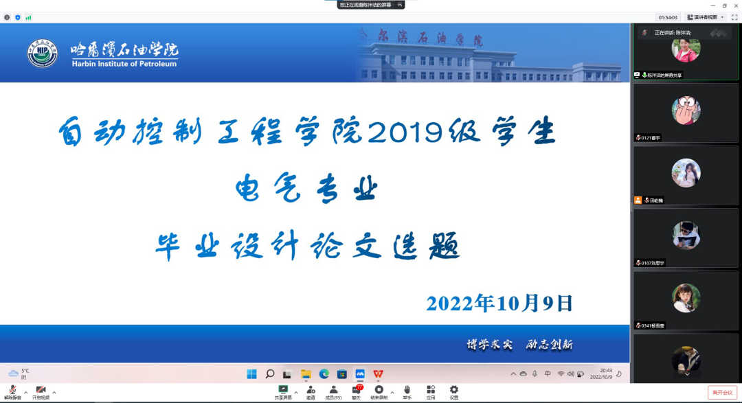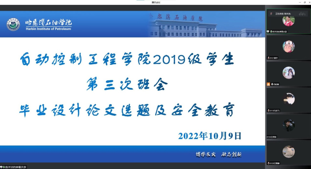 为了提高本科毕业设计工作质量,规范毕业设计工作流程,自动控制工程学院于2022年10月9日在线上开展2019级学生本科毕业论设计(论文)选题工作会以及安全教育大会,2019级学生按专业参会。