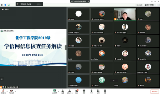 为了指导学生顺利完成校友邦中实习阶段教学任务,布置个人信息核查任务,2022年10月25-26日,化学工程学院召开2019级学生第五次主题班会,本次班会主题为阶段性教学任务布置及学生信息核查要求解读。学院副院长彭殿宝、辅导员马志强主讲,2019级学生线上参会。