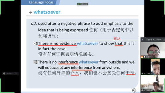 郑老师首先以提问形式复习上节课知识点,然后指出本节课主要学习内容和重难点,PPT内容充实。课程讲解中,教师和学生互动较好,提问形式多样,有主动回答,抢答,教学APP随机抽选,老师提问等形式,保证学生上课的最佳状态,有效地提升学生的学习积极性。同时,整个课程中,教师全程开摄像头,尽力保持线下课的教与学的效果,为保证网络通畅,回答问题的同学主动打开摄像头,有助于教师组织教学。整堂教学中,师生配合较好,有利于大一学生基础知识的积累,为英语四六级考试打下夯实的基础。