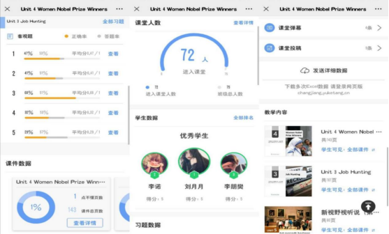 雨课堂反馈学习状态数据,及时掌握学生课堂表现。课堂上为了及时了解学生听课状态,在授课过程中会适时关注弹幕和评论区里学生留言,及时解答学生问题,课上连麦、提问等环节,增强师生互动,为了检验学生的听课效果以及知识掌握情况,每堂课都会发布雨课堂练习,如词汇练习、单句及段落翻译及作文等。题型设定可选择,主观题、客观题、投票等类型多样化。也可批量导入题量稍大些的客观题作为随堂练习或测试。雨课堂会及时把课堂数据进行反馈,会根据学生课堂表现,列出优秀学生和“预警”学生名单,让教师及时掌握学生学习状态。