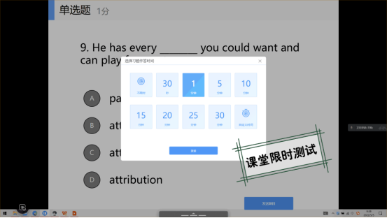 由于之前一直用的比较频繁的是雨课堂的作业和练习模式,这种模式基本无线上或线下的限制,均可利用课上或课下时间来发布任务之后来巩固相关知识点。布置作业之后,可在线上课堂中利用限定时间内来完成题目并提交。超时未完成的同学也会显示在名单列表中作为平时过程性评价的衡量标准之一。客观题类型的部分可以在题目发布之后由系统自动评分后生成班级内的成绩排名列表,作业及习题形式在布置时可设置规定的具体完成限定时间。这样会有效提高学生的应试状态的紧迫感和解题效率,熟练运用各类题型的解题策略。