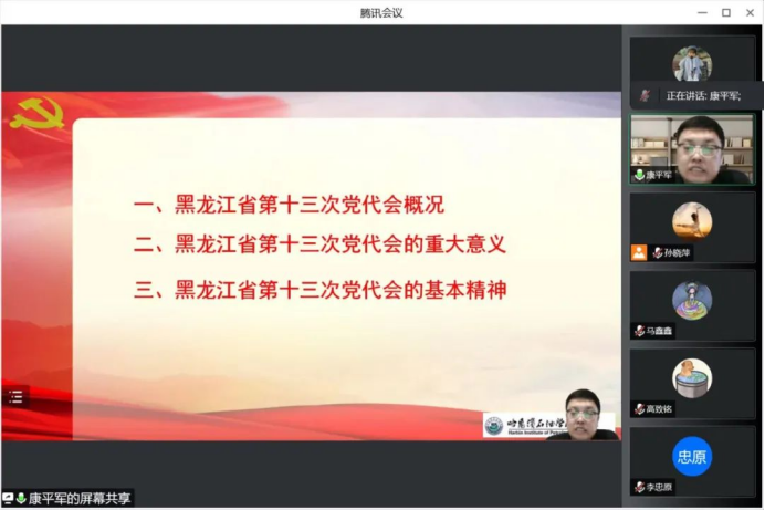 校长助理康平军从以下三个角度讲解了省第十三次党代会精神。一是黑龙江省第十三次次党代会概况。此次大会高举中国特色社会主义旗帜,坚持以习近平新时代中国特色社会主义思想为指导,深入贯彻习近平总书记讲话重要指示精神,践行初心,勇担使命,为实现黑龙江全面振兴,全方位振兴而奋斗。二是充分认识,深刻领会省第十三次党代会的重要意义。大会为黑龙江全面振兴,全方位振兴奠定的坚实的思想基础;大会是向第二个百年奋斗目标进军的关键时期,开启新进程的重要标志;大会产生了新一届领导班子,这是带领全省党员谱写伟大复兴中国梦的组织保证;大会实现了解放思想,鼓舞士气,提振了广大党员的精气神,为向第二个百年奋斗目标进军汇聚起了强大合力。三是黑龙江省第十三次党代会的基本精神。党代会报告分为以下四大部分:首先,全面建成小康社会,全省各项事业取得新成效;其次,始终沿着习近平总书记指引的方向容易前行,以坚定信心和航扬斗志,再创龙江新辉煌;然后,以新发展理念引领高质量发展奋力推进全面振兴全方位振兴开创新局面;最后是全面加强党的建设,在新的赶考之路上展现新作为。