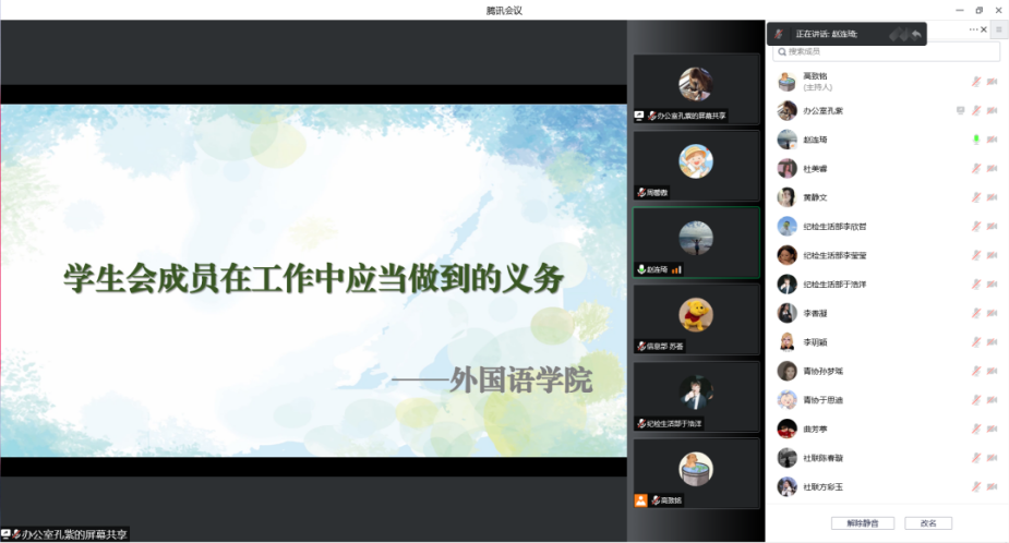 为深学笃用习近平新时代中国特色社会主义思想,不断完善和巩固学生会组织领导体制,提高学生会全体学生骨干的整体素质和工作能力,外国语学院于9月7日开展线上学生会组织改革培训会,由团总支书记赵连琦主持召开,全体学生会成员参与。