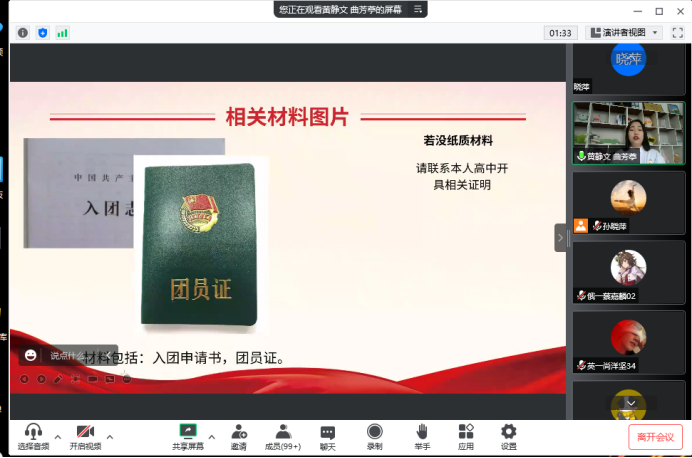 首先由团总支副书记曲芳婷向新生介绍团务工作活动的三方面重点:一、青年大学习,她向同学们阐述了青年大学习对广大青年思想建设上的积极作用,以及如何注册外国语学院的青年大学习账号。二、主题团日活动,按规定各学院每学期组织开展2~3次主题团日活动。根据疫情情况,相应采取线下线上两种形式。三、团籍,她向新生们强调大家返校时一定要将团籍带回学校上交到学院。若没有纸质材料,可以联系自己的高中开具相关证明。