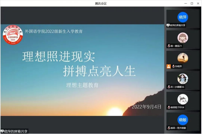 立志而圣则圣矣,立志而贤则贤矣。理想信念课对于大学生来说十分关键,是不可或缺的精神之“钙”。为助力学生成长成才,树立坚定的理想信念,外国语学院于9月4日开展“理想照进现实,拼搏点亮人生”为主题的线上新生入学教育活动,由外国语学院党总支书记孙晓萍主持召开,全体22级新生参与。