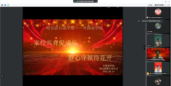 本次2022级新生家长的“云”相聚,成功连接了学院教育与家庭教育,进一步推进了学院的家校共育工作,使得新生及家长对大学的学习生活有了清晰的认知。外国语学院将持续做好家校共育工作,培养出一代又一代的有志青年。