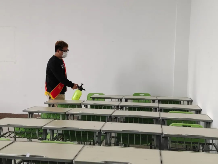 为积极响应疫情常态化防控要求,保障全体师生的健康,给同学们在校学习期间提供安全卫生的学习环境,并为线下复课做好充足的准备。外国语学院青年志愿者协会组织于2022年9月18日开展“健康校园,你我同行”教室消毒活动。