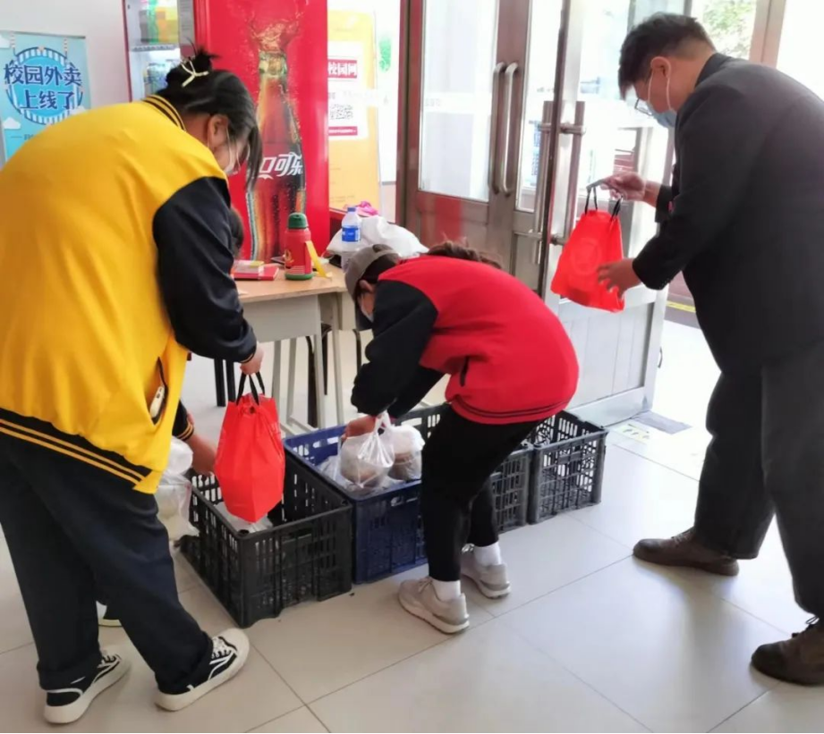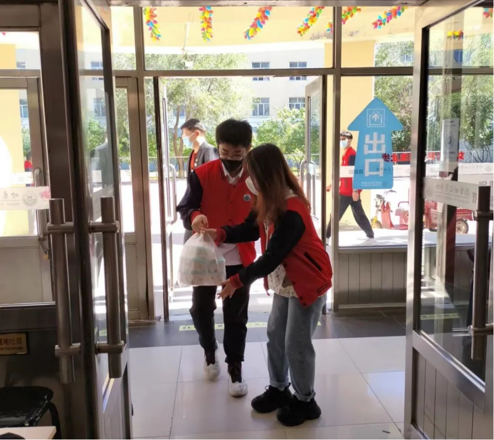 疫情当下,为避免人员交叉,保障学生们的日常饮食供应,保证在校师生的健康,严格落实校园管理措施,外国语学院统一组织志愿者送餐到各个楼层,再由党员老师送到学生的门前。在整个送餐过程中,志愿者们以认真负责的态度将隔离餐送至隔离区指定位置,分工明确,保障隔离中同学们的生活需求。不断地往返奔波,尽力将热乎的饭菜送到新生手中,全力保证新生的日常需要。