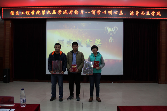 学风考勤月在一个月的时间内对同学们的上课出勤、早操、晚自习、寝室卫生等情况用量化的方式体现出来,由专门的 部门进行每天考核打分,于当晚评选出了获得学风考勤月活动期间的优秀个人、标兵寝室等荣誉称号的团体,孙朝阳,宫雪薇两位同学以出色的表现获得标兵个人;任笑抒,宋昊阳同学获得优秀个人;433,335寝室获得标兵寝室称号;412,309获得优秀寝室称号,为鼓励同学们继续努力,信息工程学院领导人为获奖人员颁奖。