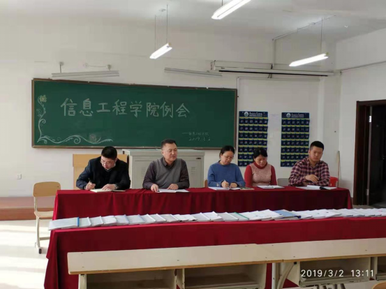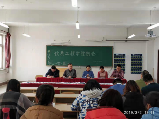 为传达学校新学期工作会议精神,落实新学期的各项工作,2019年3月2日,信息工程学院于二教405召开新学期工作布置及例会。会议由院长胡文教授主持,全体教工参加会议。
