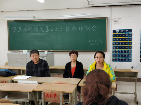 为了更加明确了新学期的工作目标及方向,更是为了教师们能营造一个相互交流学习的氛围。2018年9月18日,信息工程学院于二教407召开新学期第五次工作例会。会议由副院长朱佳梅主持,学院班子成员及全体教工参加会议。