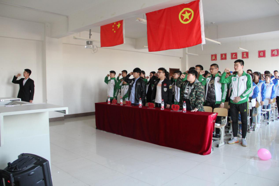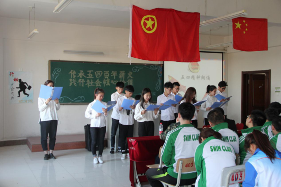 本次活动以一段五四爱国教育视频拉开帷幕,唤醒了同学们的爱国情怀。同学们齐唱中国共产主义青年团团歌《光荣啊,中国共青团》,17级学生代表带来了诗朗诵《青春心向党 筑梦新时代》将活动推向高潮。随后,在孙志远同学的带领下,团员们集体起立宣誓,重温入团誓词。五四运动以来,在中国共产党领导下,一代又一代有志青年,在救亡图存、振兴中华的历史洪流中谱写了一曲曲青春乐章。同学们共同回顾光辉历程,愿我们的祖国繁荣昌盛。