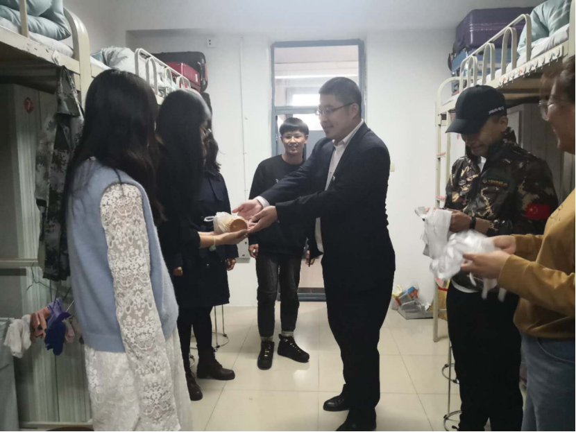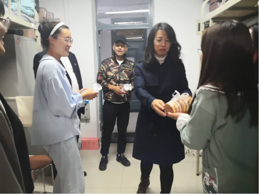 晚九时,院长朱佳梅、党总支书记毛雷、党总支副书记,2020级辅导员张宏鹏和学生会干部来到新生寝室为同学们分发月饼,同他们一起共度佳节。圆圆的月饼包含着学院对新同学的款款深情,也成为疫情防控新形势下学生们心中荡起的一股别样暖流。