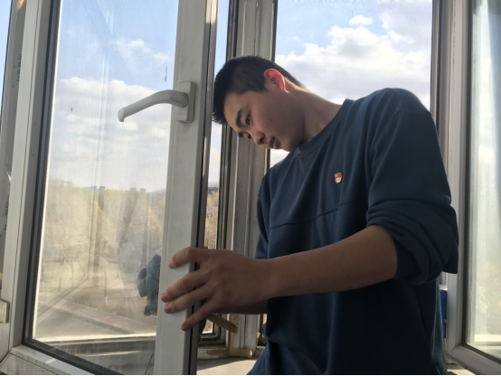 党员志愿为值班室擦洗玻璃、清理窗框积灰