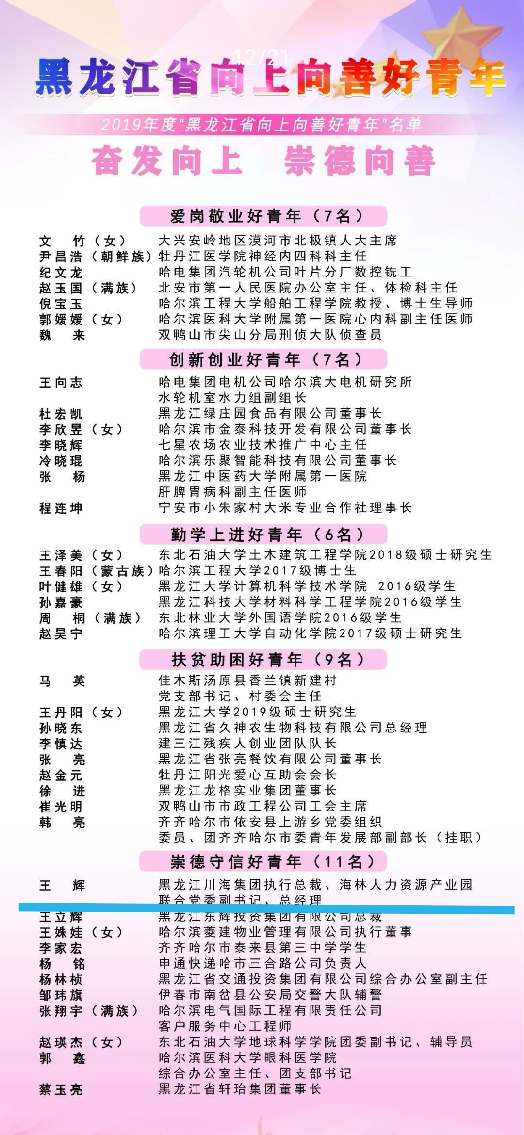 四年育苗桃李,再结硕果添香!冰球突破豪华版官方网站2008级优秀校友川海集团执行董事王辉荣获2019年度“黑龙江省向上向善好青年”崇德守信好青年殊荣!